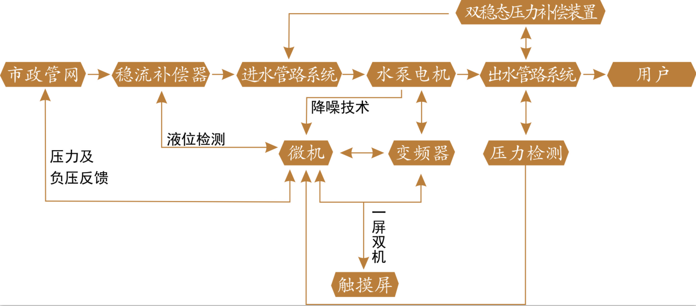 無負(fù)壓供水設(shè)備采用微機變頻技術(shù)、降噪技術(shù)、一屏雙機技術(shù)、雙穩(wěn)態(tài)壓力補償技術(shù)、負(fù)壓處理技術(shù)實現(xiàn)無負(fù)壓供水。通過觸摸屏顯示運行狀態(tài),通過微機控制、雙穩(wěn)態(tài)壓補償裝置及真空補償系統(tǒng),實現(xiàn)了與自來水管網(wǎng)直接串接,并且克服了對管網(wǎng)的不良影響。